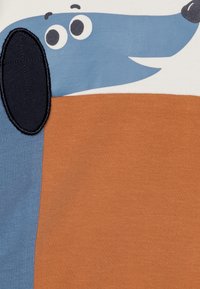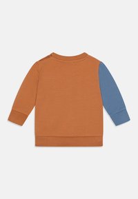 Sweatshirt coloré avec un graphique de chien bleu. Fabriqué en coton doux, avec un design en blocs de couleur orange et bleu, col et poignets côtelés.