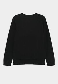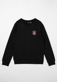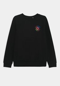 Sweatshirt noir en coton à manches longues, avec un logo Pokémon coloré et un design de Poké Ball sur la poitrine gauche.