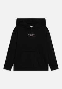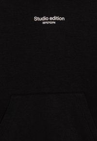 Sweat à capuche noir avec une poche avant, arborant le texte "Studio edition" en blanc. Tissu doux, manches longues et grande capuche. Design simple.