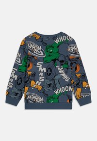 Sweatshirt gris arborant des super-héros Marvel dans un style bande dessinée, en vert, orange et noir. Poignets et taille côtelés ; détail du logo "MARVEL".