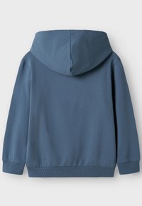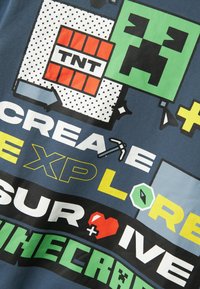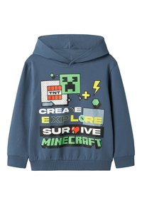 Sweat à capuche bleu avec un graphique frontal présentant des icônes sur le thème de Minecraft, incluant un creeper, de la TNT et des phrases telles que « CRÉER », « EXPLORER », « SURVIVRE ».