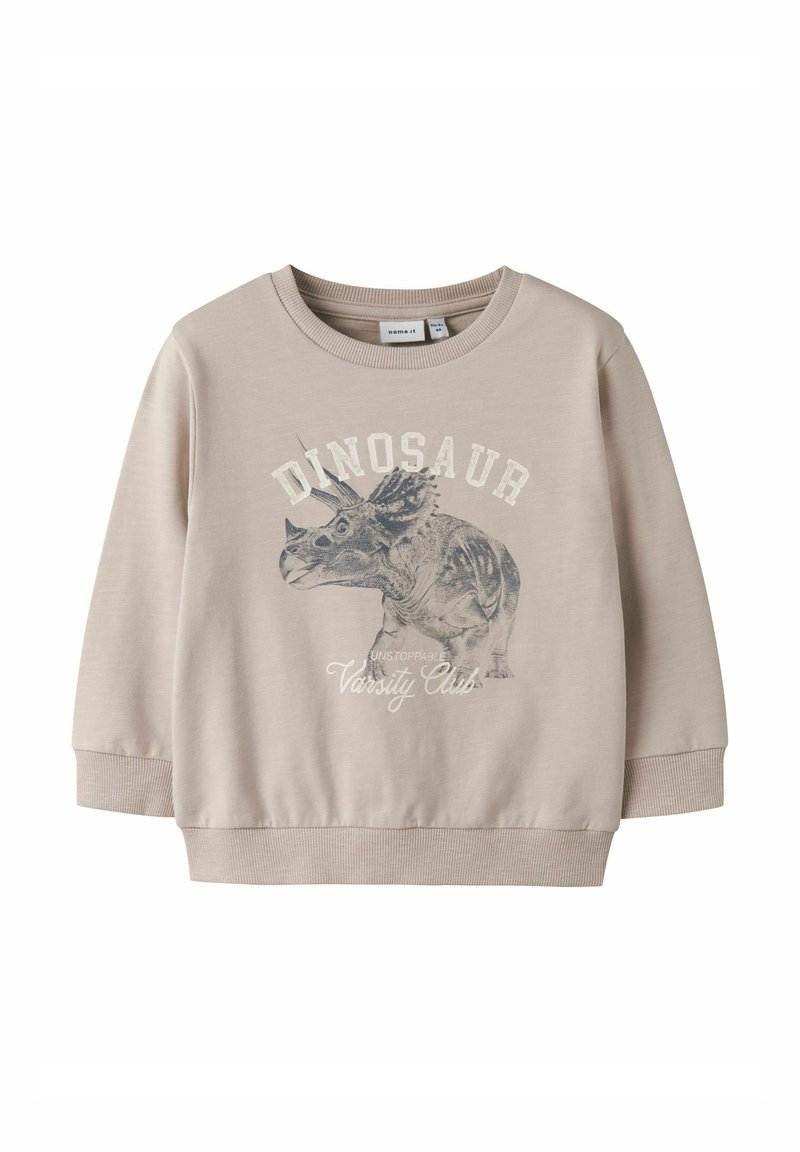 Sweat-shirt beige pour enfants avec un motif de dinosaure tricératops et le texte "DINOSAUR Unstoppable Varsity Club" sur le devant.