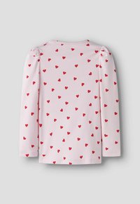 Chemise rose à manches longues pour enfants avec un petit motif de cœurs rouges et un léger détail de fronce sur les épaules.