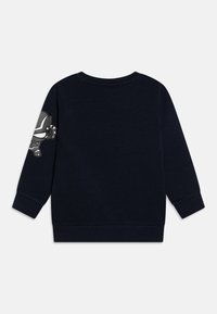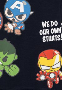 Sweat-shirt bleu marine avec des impressions de personnages colorés : Captain America, Hulk, Iron Man et Black Panther. Le texte indique "NOUS FAISONS NOS PROPRES ACROBATIES !"