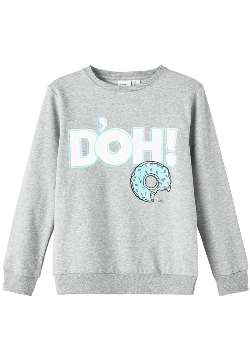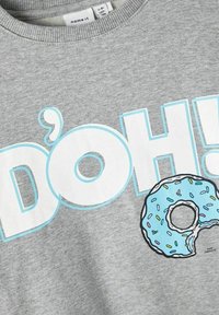 Sweat-shirt gris avec le texte "D'OH!" et un donut bleu givré avec une bouchée manquante sur le devant, poignets et ourlet côtelés.