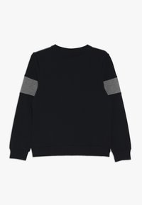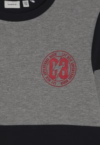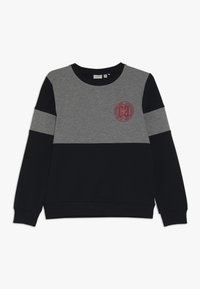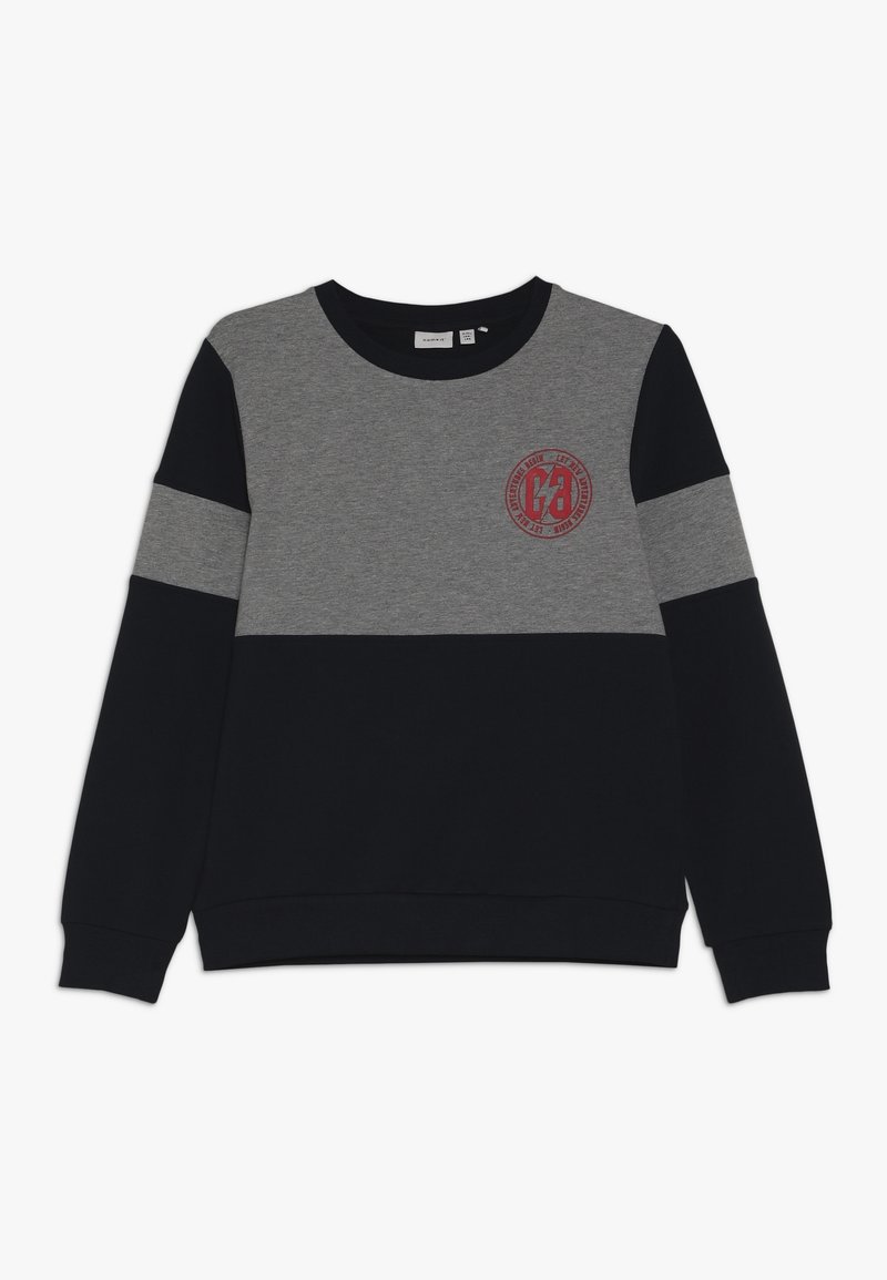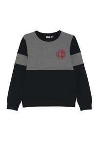 Sweatshirt coloré en blocs noir et gris avec un col rond, des poignets côtelés et un logo circulaire sur la poitrine. Texture de tissu douce.