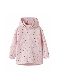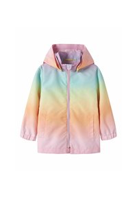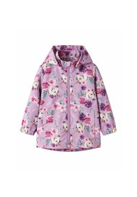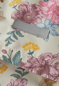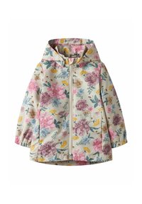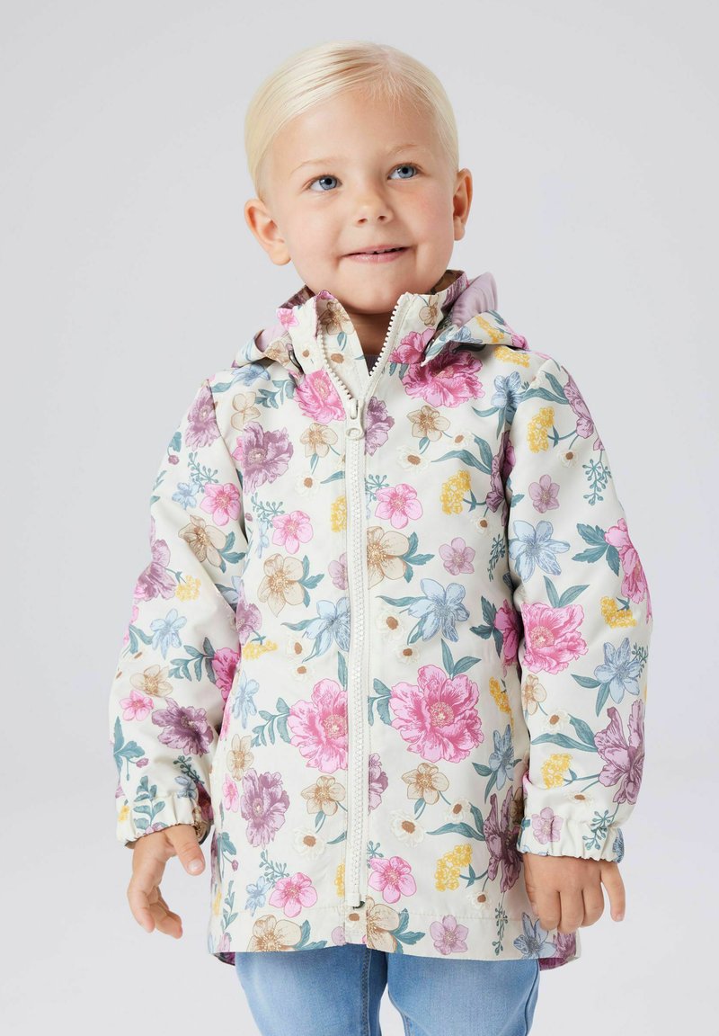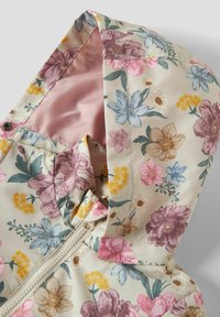 Jeune enfant aux cheveux blonds portant une veste blanche ornée de motifs floraux roses, jaunes, violets et bleus, debout devant un fond uni.