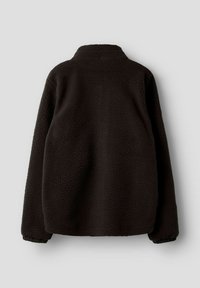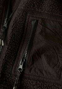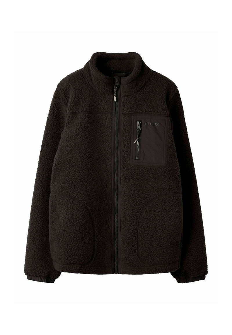Veste polaire noire à fermeture éclair complète avec col montant, poignets élastiques, deux poches avant et une poche poitrine zippée avec détail en tissu.
