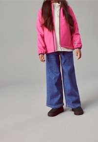 Veste zippée rose vif sur un haut en polaire crème, associée à un jean en denim bleu à jambes larges et des chaussures noires à enfiler. Texture lisse partout.