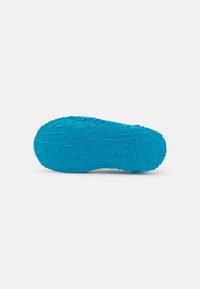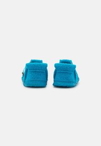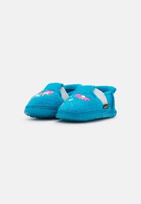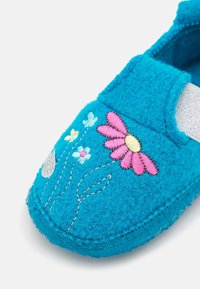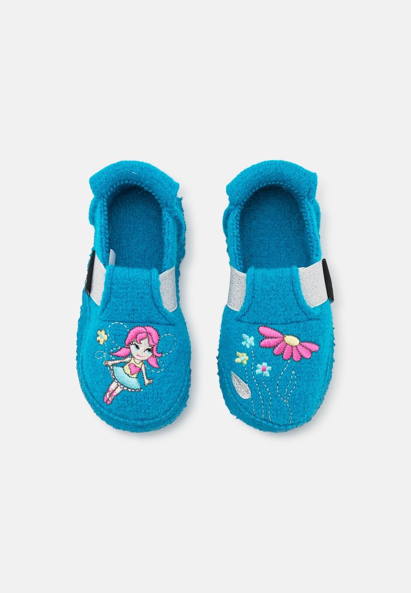 Pantoufles en polaire bleu avec broderies décoratives représentant une fée et des fleurs, design à enfiler, semelle texturée et accents élastiques.