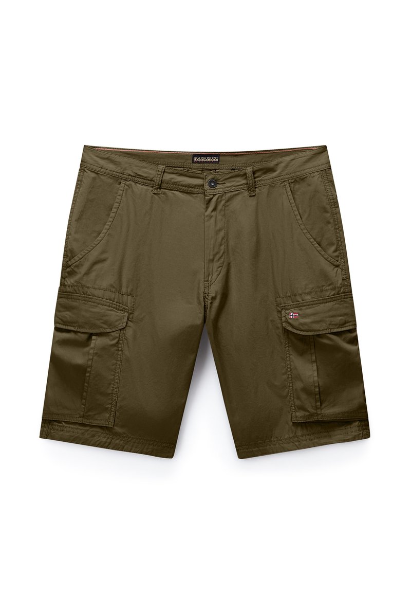 Shorts cargo vert olive avec poches avant, fermeture à bouton, passants de ceinture, et petit détail avec drapeau norvégien sur le rabat de la poche droite.