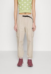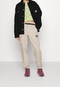 Femme portant un pantalon cargo beige avec ceinture noire, un crop top floral vert, des chaussettes blanches et des baskets mauves, debout sur un sol sombre.
