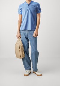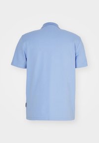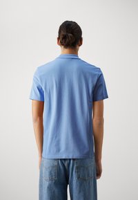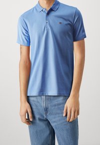 Polo bleu clair avec un col, manches courtes et trois boutons. Présente un petit logo brodé sur la poitrine gauche.