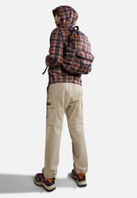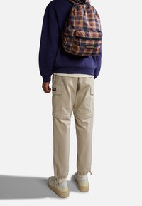 Vue arrière d'une personne portant un sweat-shirt violet foncé, un pantalon cargo beige avec des poches, et des baskets blanches, portant un sac à dos à carreaux.
