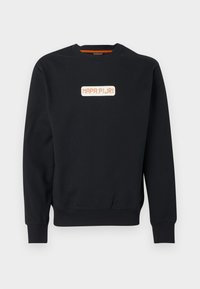 Sweat-shirt à col rond bleu marine à manches longues avec le logo blanc "NAPAPIJRI" sur la poitrine gauche, étalé à plat sur un fond clair.