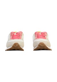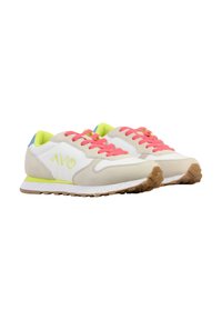Baskets beige et blanches avec lacets roses, accents jaune néon, languette bleue au talon et semelle texturée orientée vers la gauche.