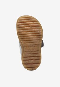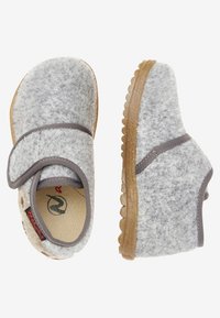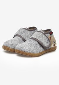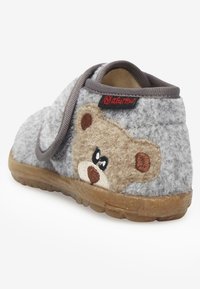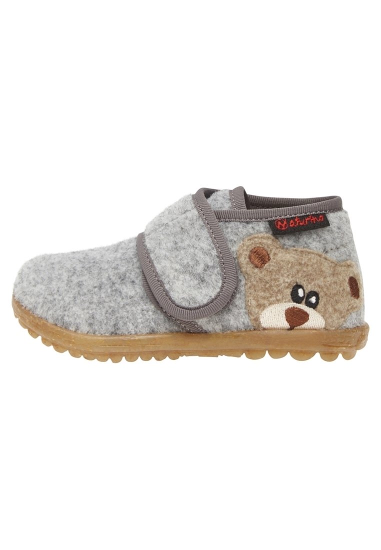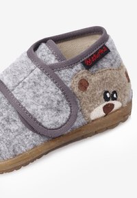 Pantoufles grises en feutre avec une sangle Velcro sur le côté, ornées d'un motif de visage d'ours en marron et beige. Semelle en caoutchouc pour une bonne adhérence et durabilité.