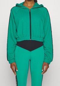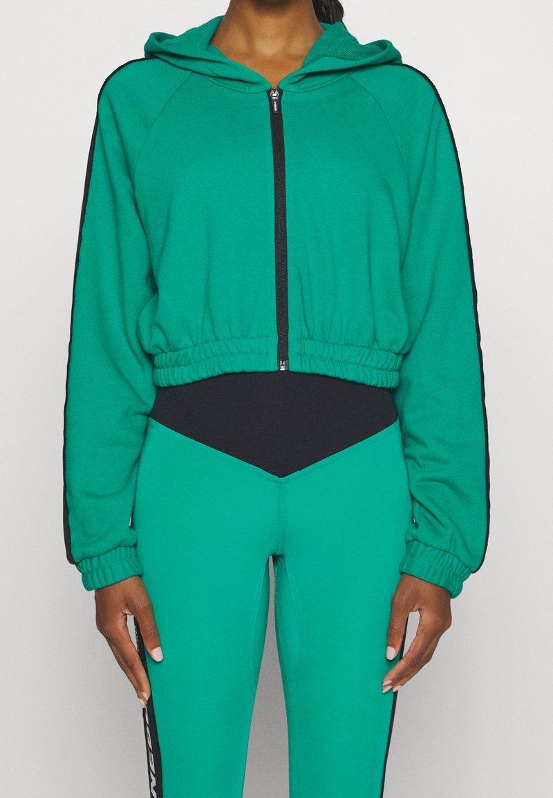 Sweat à capuche zippé vert avec un accent rayé noir, doté d'une capuche et d'un ourlet élastique. Associé à des leggings ajustés verts assortis avec des détails noirs.