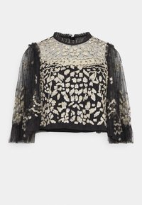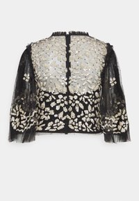 Crop top noir avec des manches en tulle noir transparent, orné de motifs floraux en sequins dorés et argentés complexes et d'un col à volants.