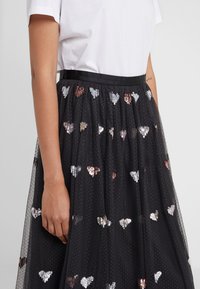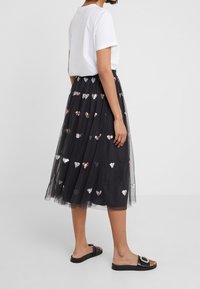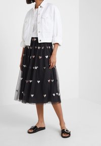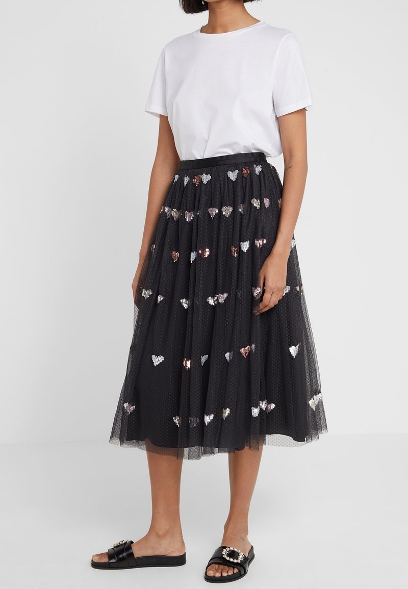 Jupe en tulle noire ornée de sequins en forme de cœur dispersés en argent, or et rose. Associée à un t-shirt blanc uni et des sandales noires à enfiler.