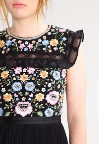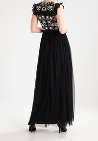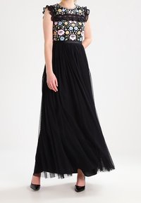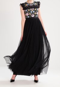 Robe maxi avec jupe en tulle noir et corsage en broderie florale avec des manches volantées. Accentuée d'une taille cintrée et de talons.