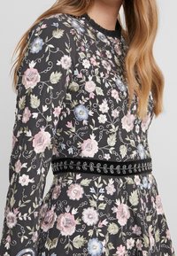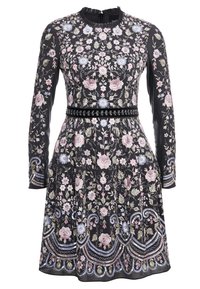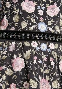Robe noire à manches longues présentant des motifs floraux pastel et un ourlet festonné brodé de motifs floraux bleus, roses et verts.