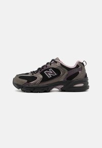 Chaussure de sport New Balance noire et grise avec des panneaux en maille, des accents roses, une fermeture à lacets et une semelle rembourrée marquée "ABZORB".