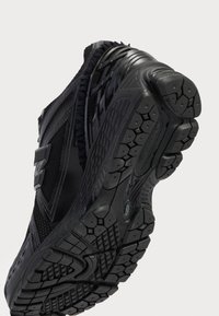 Baskets de sport noires avec dessus texturé, semelle épaisse segmentée, fermeture à lacets et logo discret de la marque près du talon sur fond blanc.