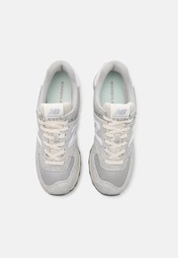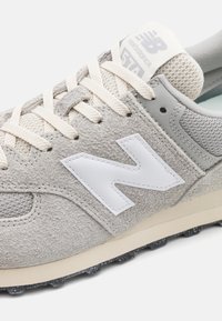 Baskets New Balance gris et blanches avec dessus en daim et mesh, semelle intermédiaire beige, semelle extérieure noire et logo "N" blanc sur le côté.