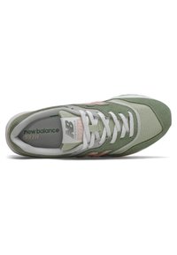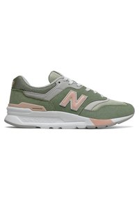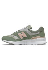 Baskets New Balance vert olive et beige avec logo "N" blanc, accents en daim, design à lacets et semelle épaisse et rembourrée, présentées de profil.