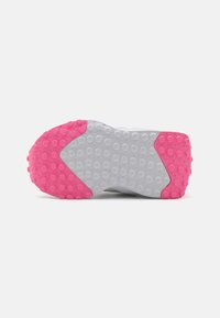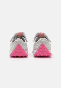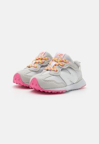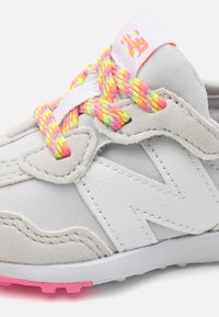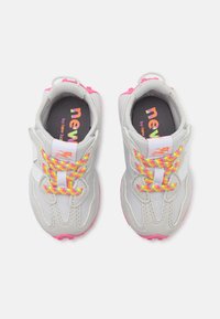 Baskets grises et blanches avec une semelle extérieure néon rose et des accents. Présente des matériaux en suède texturé et en synthétique lisse. Lacets multicolores.