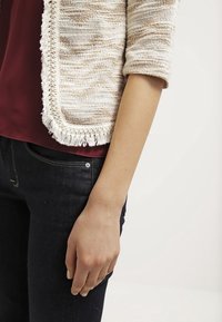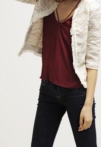Veste beige clair texturée à ouverture avant avec bords effilochés, portée sur un caraco bordeaux, associée à un jean denim foncé.