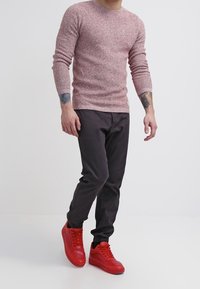 Homme portant un pantalon de jogging foncé, un pull rose texturé et des baskets montantes rouges vives, debout sur un fond blanc.