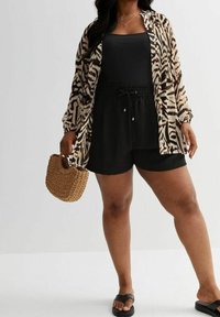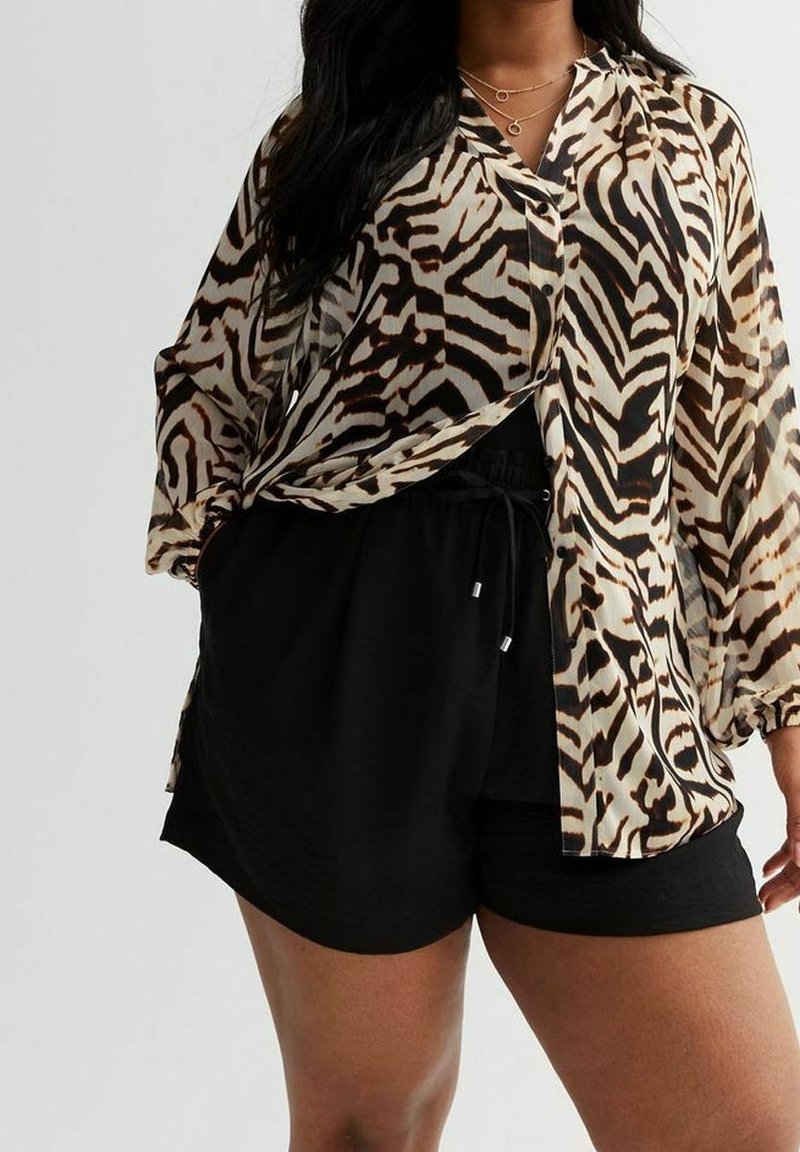 Femme portant un short noir à cordon de serrage et un chemisier manches longues à imprimé zébré avec plusieurs colliers en or superposés, sur un fond uni.