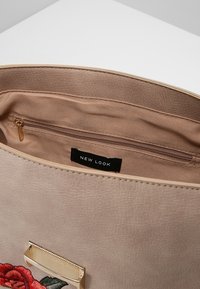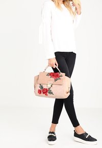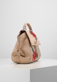 Sac à main en cuir beige avec broderie florale rouge et verte, anse supérieure robuste, bandoulière réglable et détails en métal doré.