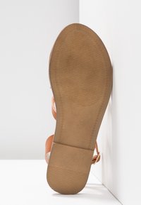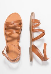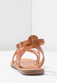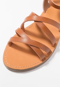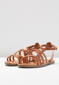 Sandales en cuir marron avec plusieurs fines lanières, fermeture à boucle à la cheville, semelle plate et semelle intérieur texturée pour le confort.