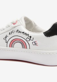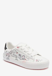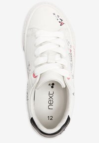 Baskets blanches en cuir avec des accents roses, graphiques détaillés incluant des étoiles et des cœurs, bout rond et lacets plats. Taille 12 indiquée à l'intérieur.