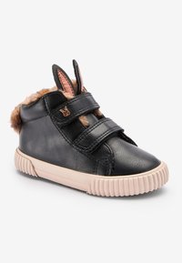 Bottines pour tout-petits en cuir noir avec doublure en fourrure, semelle en caoutchouc rose, deux sangles Velcro et oreilles de lapin décoratives sur le col.