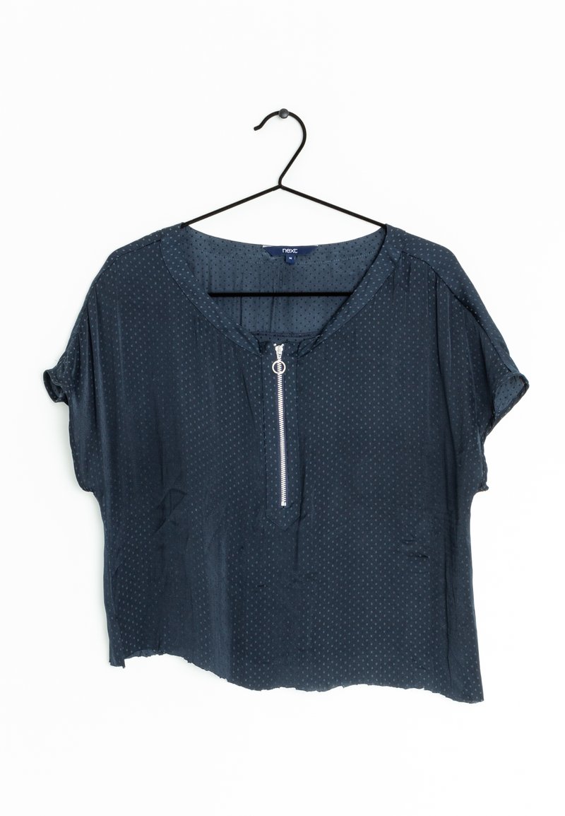 Haut à manches courtes bleu marine foncé avec un col zippé, fabriqué en tissu léger avec un motif à pois subtil. L'ourlet est légèrement inégal.