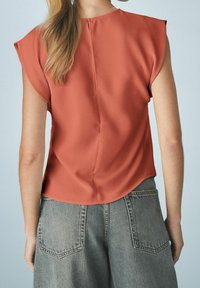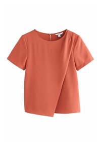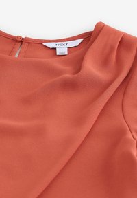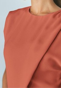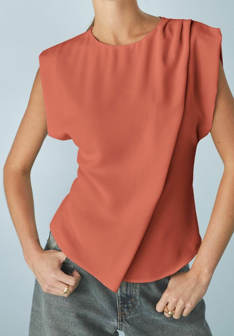 Top sans manches couleur rouille avec un design drapé et une texture douce, doté d'un col bateau et d'un ourlet légèrement asymétrique.