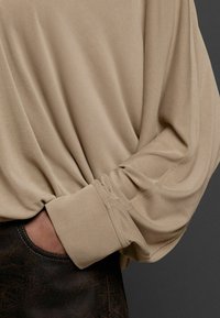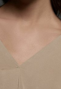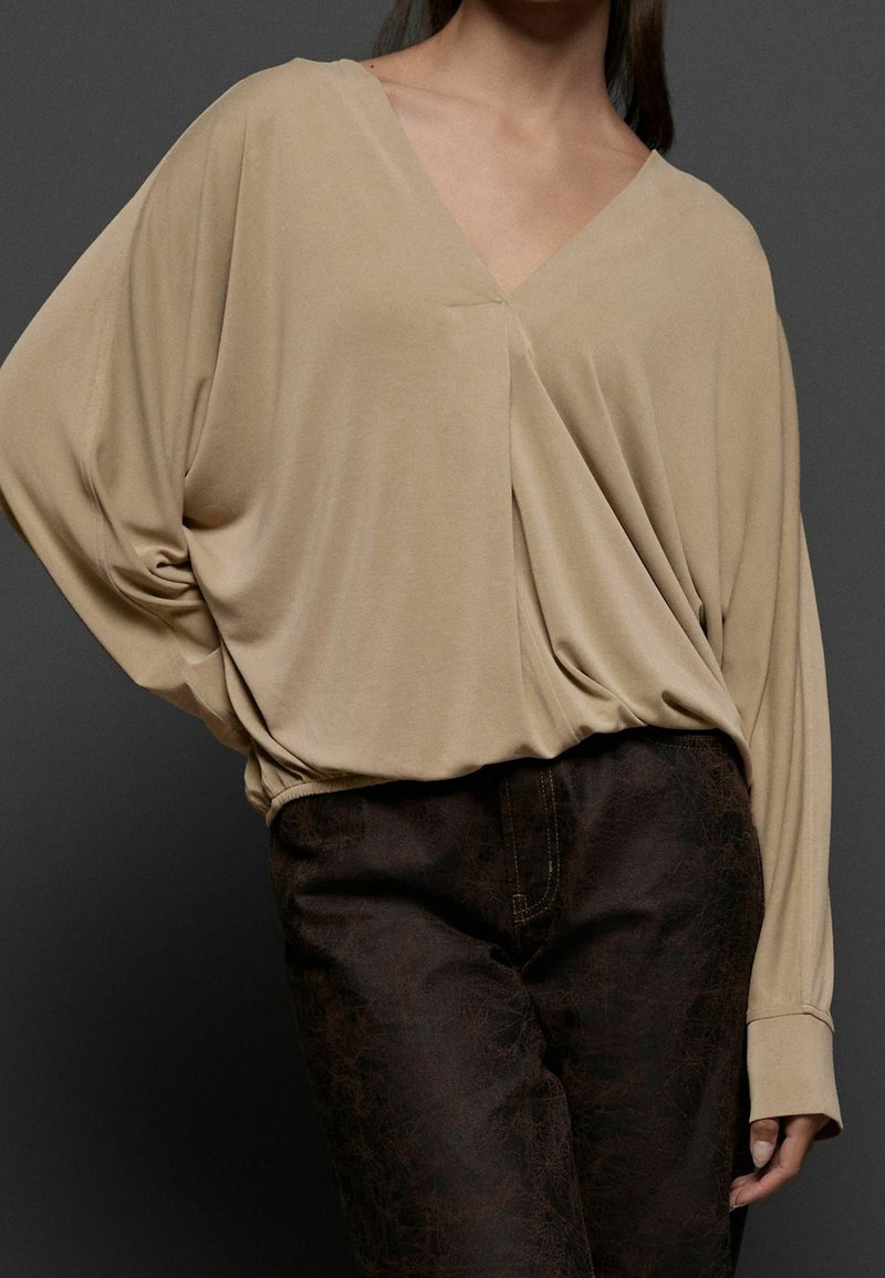 Femme portant un chemisier beige à manches longues avec col en V drapé, rentré dans un pantalon texturé marron foncé, sur fond sombre.