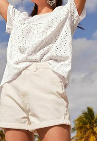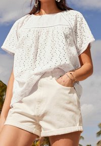 Blouse blanche brodée à manches courtes, ornée de motifs ajourés, associée à un short crème. Design simple avec une coupe décontractée.