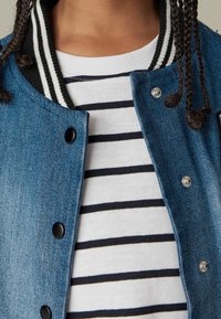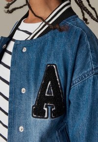 Veste bomber en denim bleu clair, avec un col et des poignets côtelés rayés noir et blanc, poches avant et un écusson en feutre portant la lettre "A".