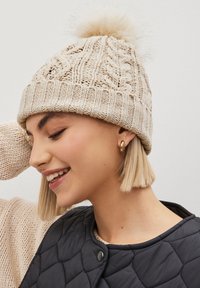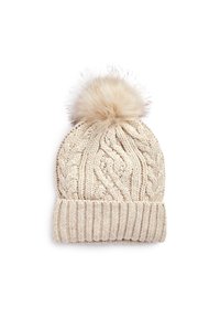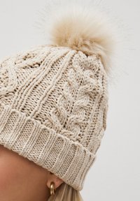 Bonnet d'hiver beige en tricot avec bord-côte et un grand pompon duveteux sur le dessus.