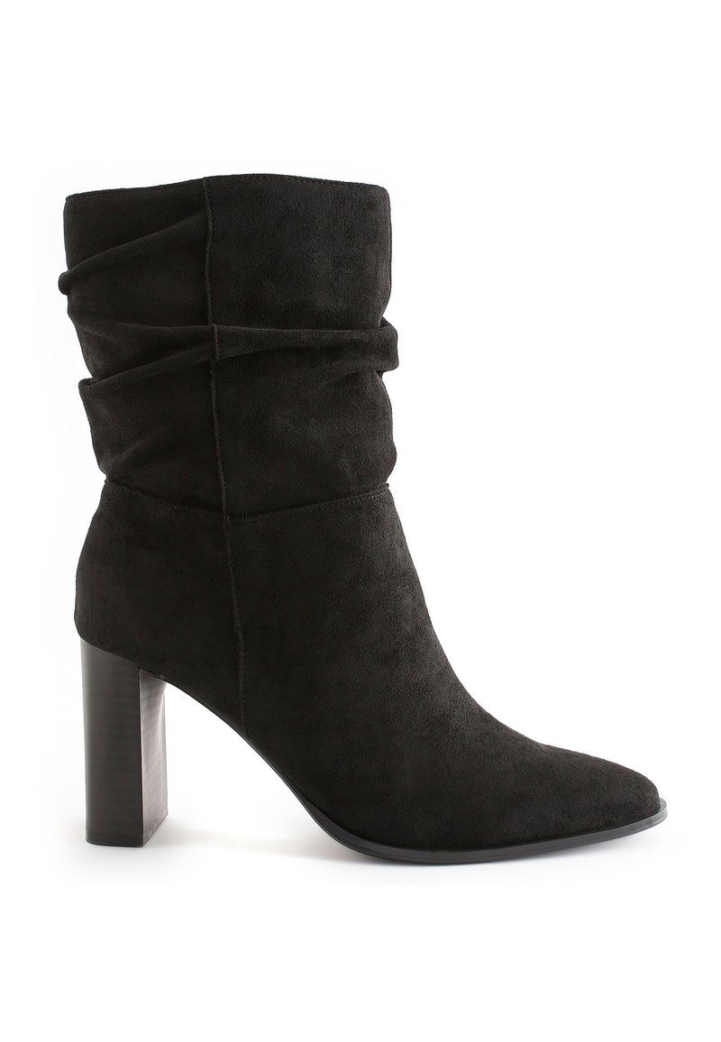 Botte pour femme en daim noir montant mi-mollet avec tige souple, bout pointu et talon haut carré sur fond blanc.
