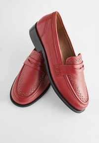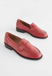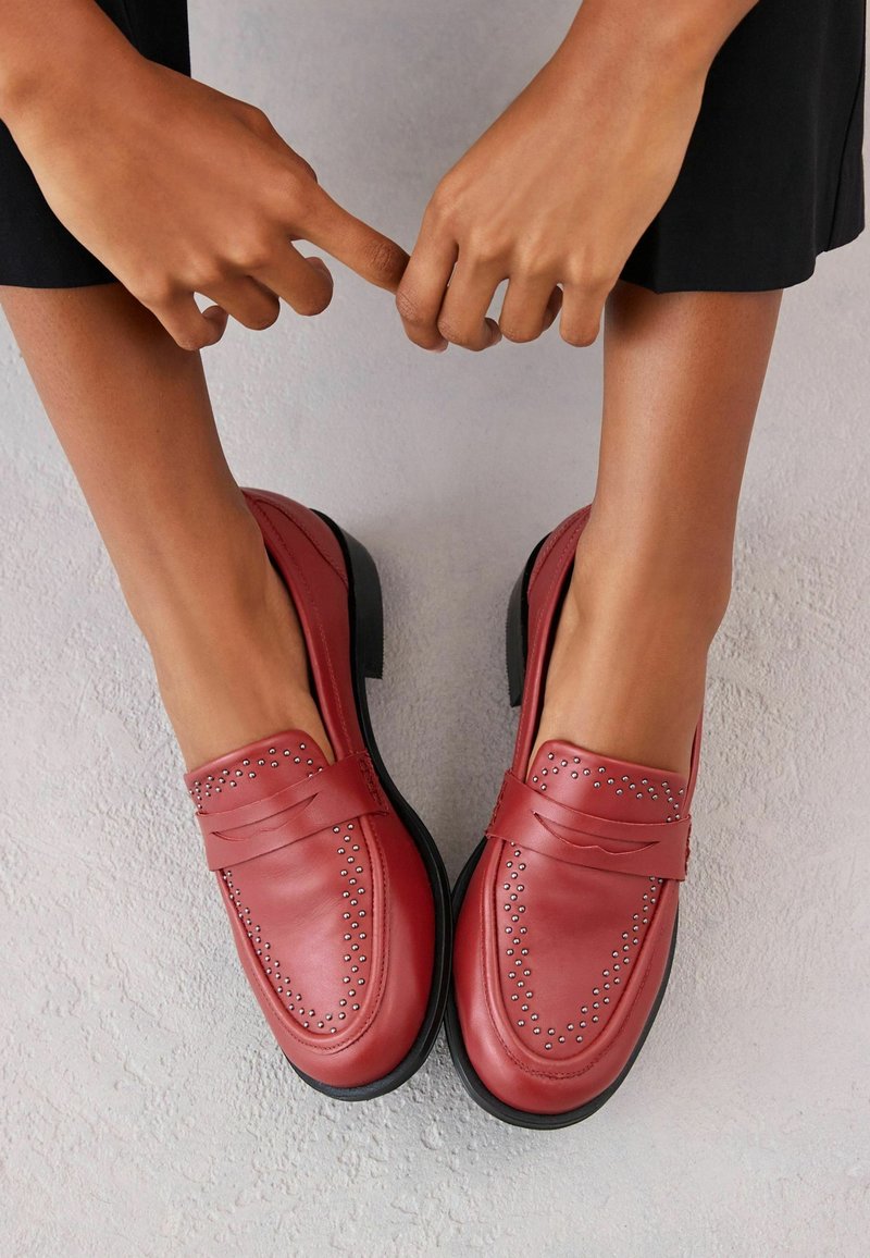 Mocassins en cuir rouge avec des clous décoratifs, semelle noire plate et détail de bande supérieure. Les chaussures sont positionnées au-dessus de deux mains sur un fond clair.