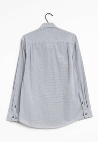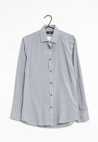 Chemise grise à manches longues avec un col boutonné, présentant un motif à carreaux subtil et des boutons foncés sur le devant, accrochée à un crochet.