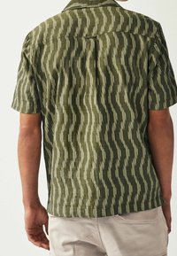 Homme portant une chemise à manches courtes boutonnée vert olive avec des rayures blanches verticales en zigzag, associée à un pantalon beige clair, les mains dans les poches.