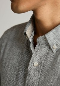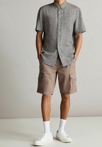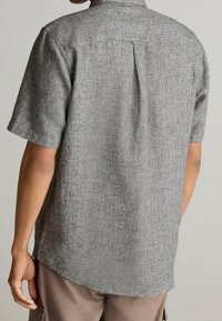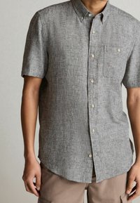 Homme portant une chemise à manches courtes grise texturée avec poche poitrine et pantalon beige, debout devant un fond neutre.