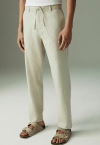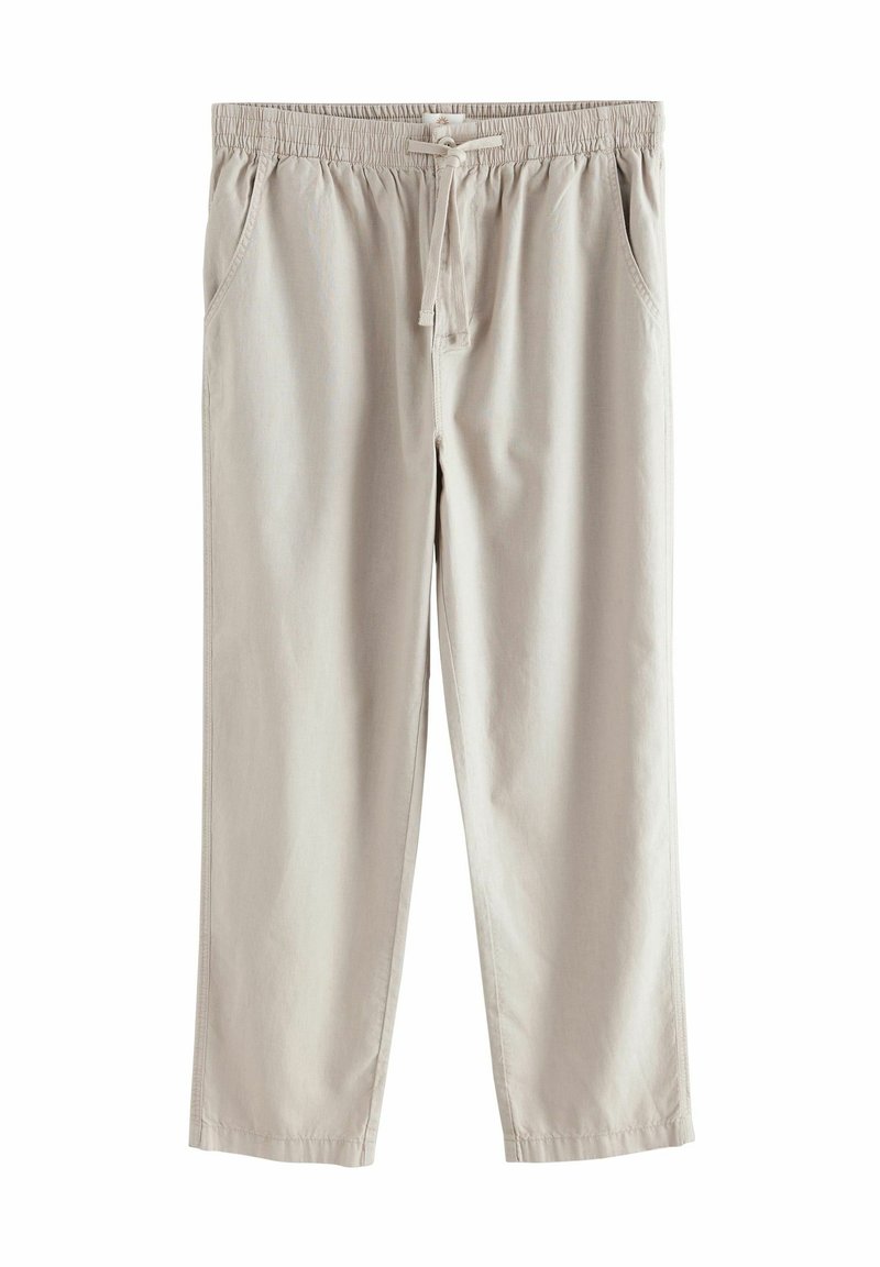 Pantalon à taille élastique beige clair avec cordon de serrage, poches latérales et coupe droite, présenté sur un fond blanc.